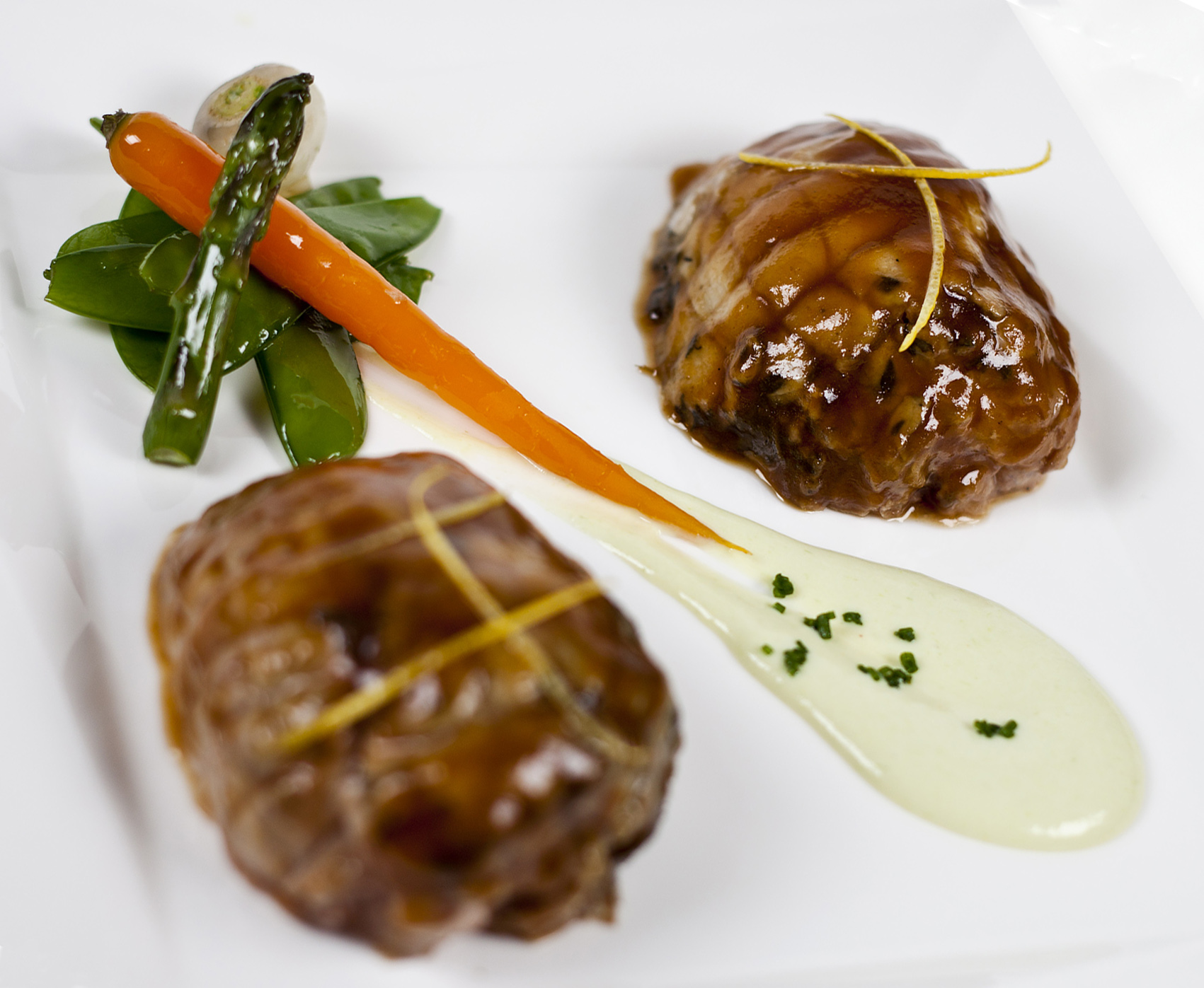 Técnica depurada en la terrina de foie-gras con confitura de zanahorias, gelée de vino de moscatel y uvas al vino tinto –la casa haría bien en contener esta generosidad enunciativa- y acierto casi pleno en una interpretación personal del bacalao Club Ranero, plato que funciona a la perfección en el paladar -sabores y texturas estupendamente trabados-, pero que, por eso mismo, merecería una presentación más nítida o atractiva que la que proponen los cocineros, con el estupendo taco del gádido enteramente sumergido en el pil-pil.