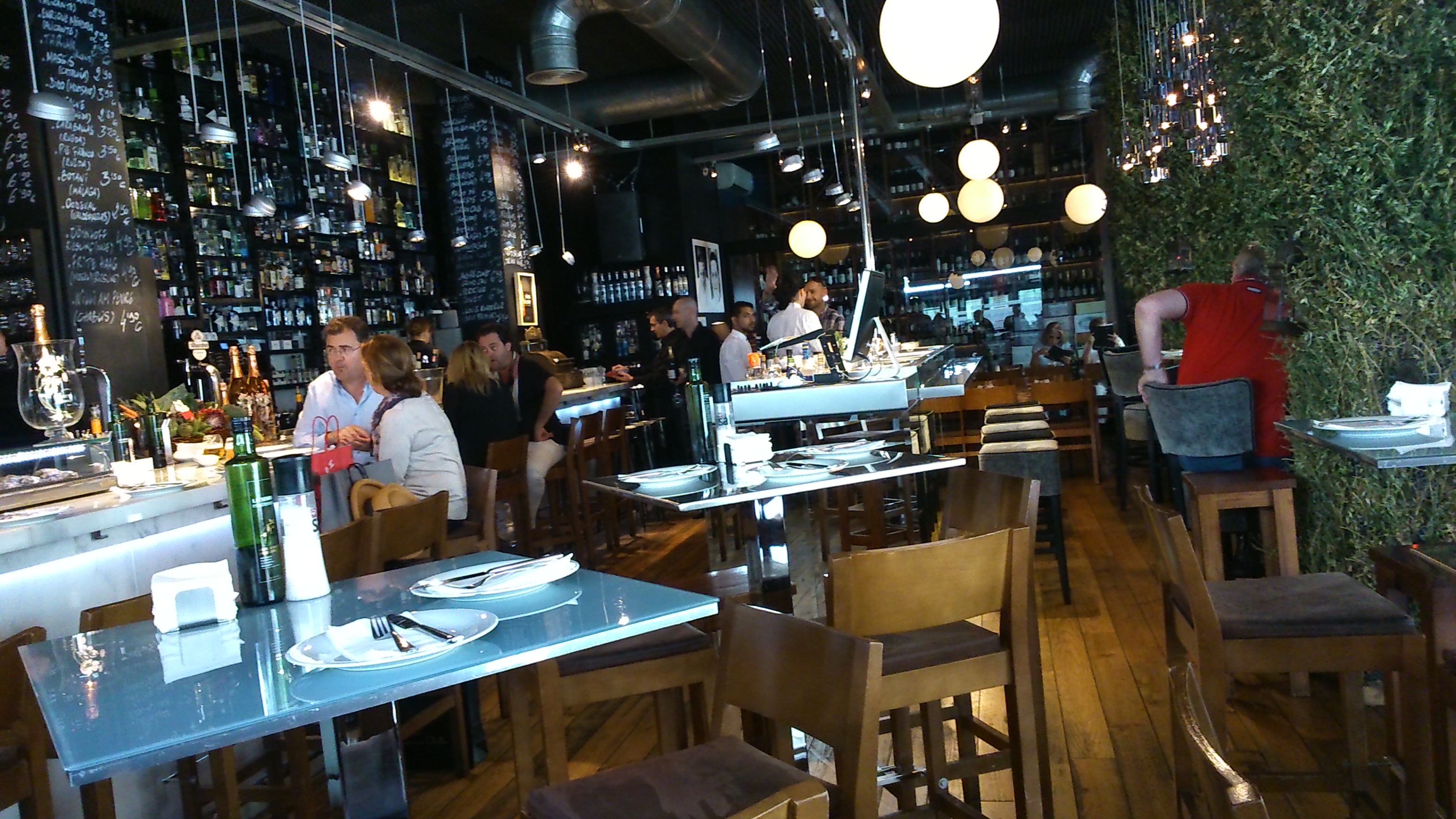 A los comensales les encantó el local nada más cruzar la puerta. Grandes ventanales, hermosas –aunque no todo lo cómodas que debieran-, mesas altas de metal, buenas maderas, magnífica iluminación, tentadora barra con el género a la vista, vinos del día en la pizarra… Les gustó menos tener que acomodarse en una de esas mesas elevadas en taburetes de difícil escalada… Pero el sitio está de moda desde que lo abrieron hace un tiempo y no habían reservado. Se lo acababan de recomendar unos amigos como uno de los más interesantes a los que se podía acudir hoy en la ciudad de Alicante.