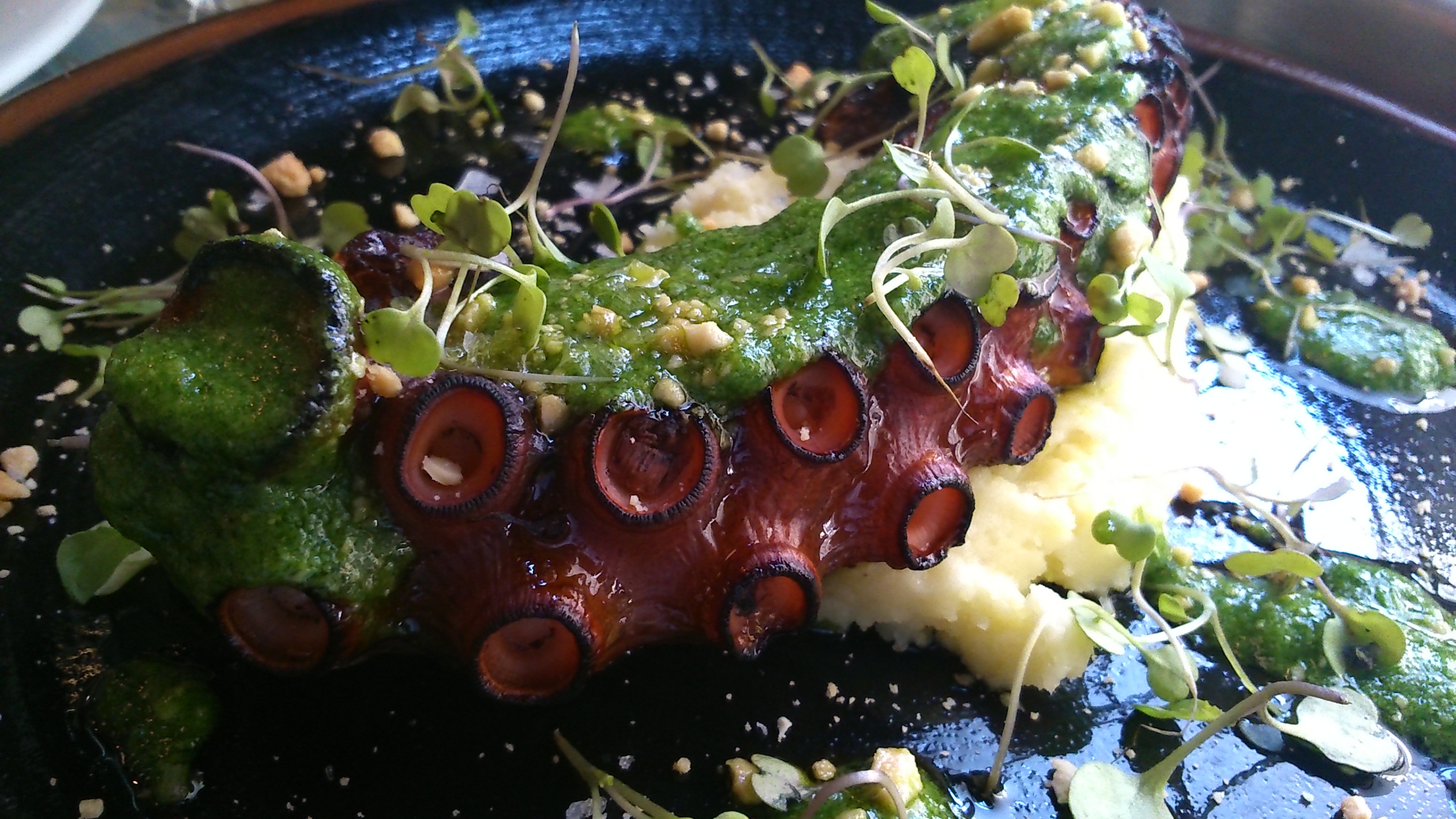 GRAN CARTA DE VINOS. Como tercera entrega, unas magníficas croquetas de boletus y jamón ibérico: de notable tamaño, sabrosas, crujientes por fuera y cremosas por dentro… Acierto pleno, como el estupendo pulpo a la brasa servido a continuación sobre un fino puré de patata, acompañado de pesto, brotes de soja y frutos secos. Para culminar la parte salada, un soberbio tartar de atún rojo, en el que la calidad del pescado competía con la precisión en el aderezo… De postre, helado de turrón de Jijona. Todo en su punto, bien presentado, perfecto para compartir. Sólida carta de vinos, con casi cuatro centenares de etiquetas.