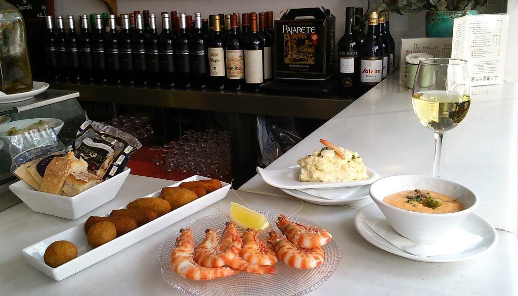 lonchas de mojama con pimienta, lima y aceite, o una ensaladilla rusa de langostinos, que también preparan con atún rojo. También son recomendables las berenjenas fritas en tiras con salmorejo –crujientes, delicadas- o un surtido de croquetas –gambas al ajillo, tortillita de camarones, mejillones en escabeche- tan sabrosas como originales.